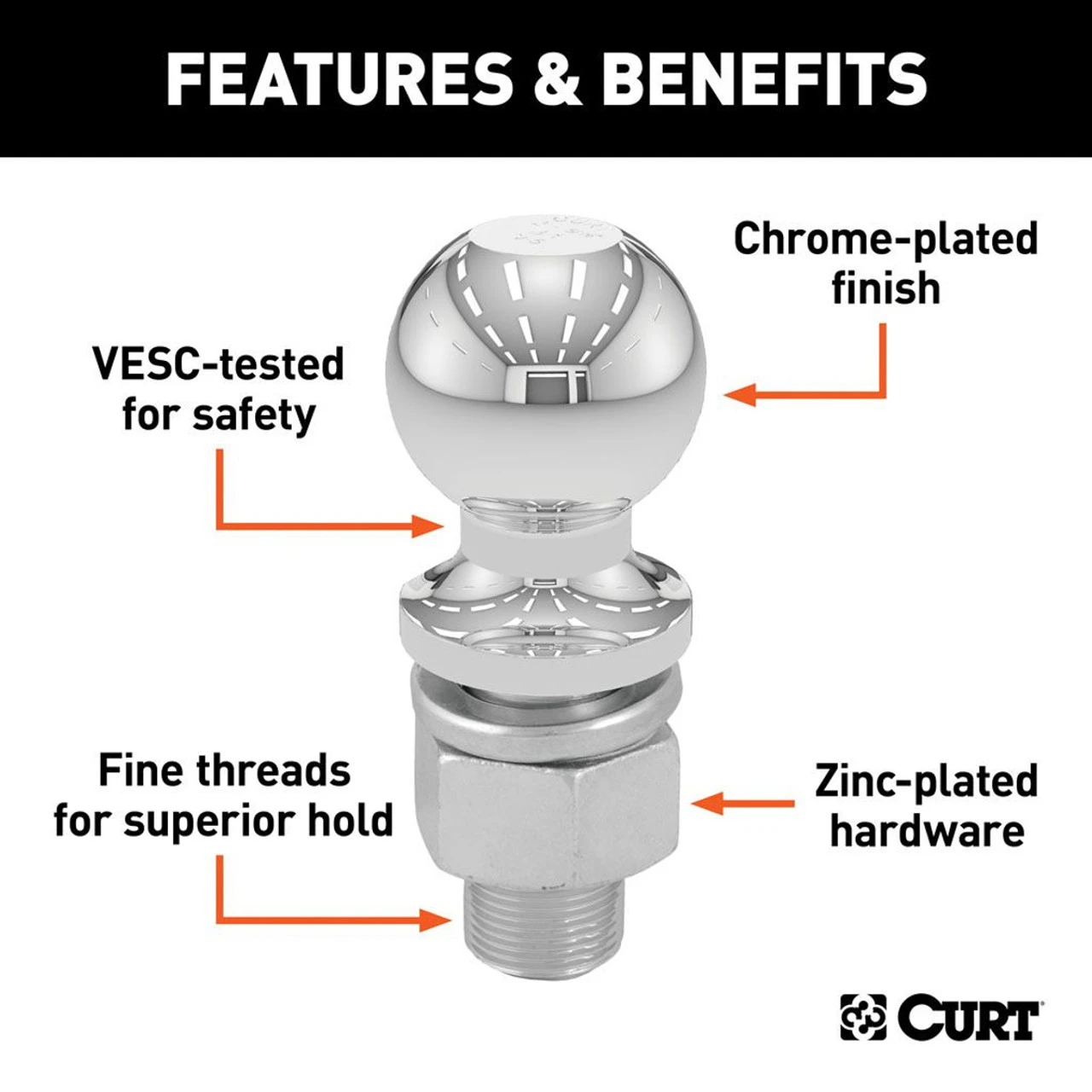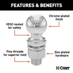 This CURT ATV tow ball / lawn tractor hitch ball has a 2″ ball diameter. This standardized dimension will fit virtually any 2″ trailer coupler, including small utility trailers, gear haulers, landscaping trailers, teardrop campers and much more (capacity limited to lowest-rated towing component). The trailer ball comes with a 1-3/4″ x 5/8″ shank to easily and securely drop into a lawn tractor tongue or ATV tongue or even a ball mount. It fastens securely with the included nut and lock washer.