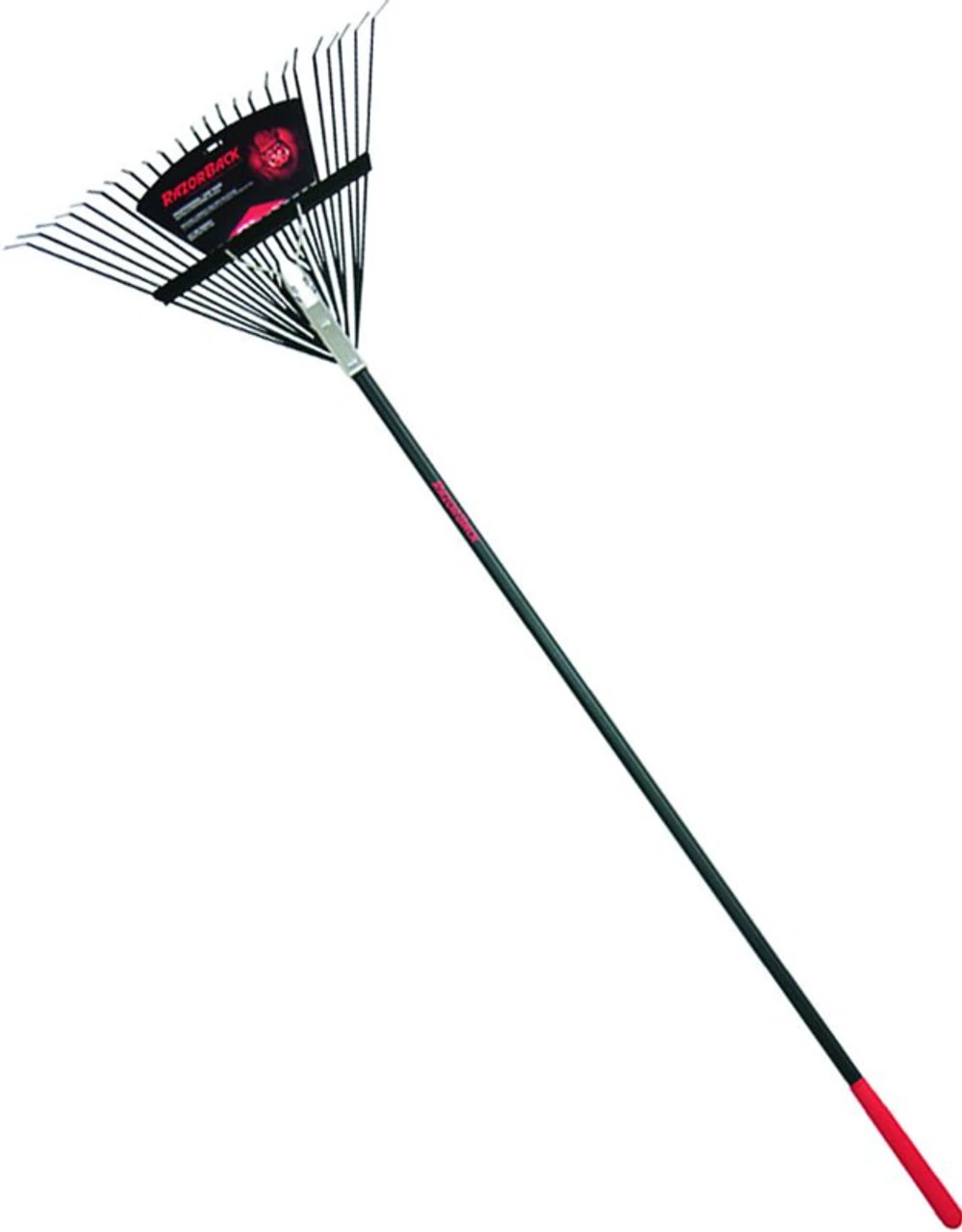 - Razor-back, 24 inches, spring brace rake, fiberglass handle, bolt thru socket & non-slip grip.