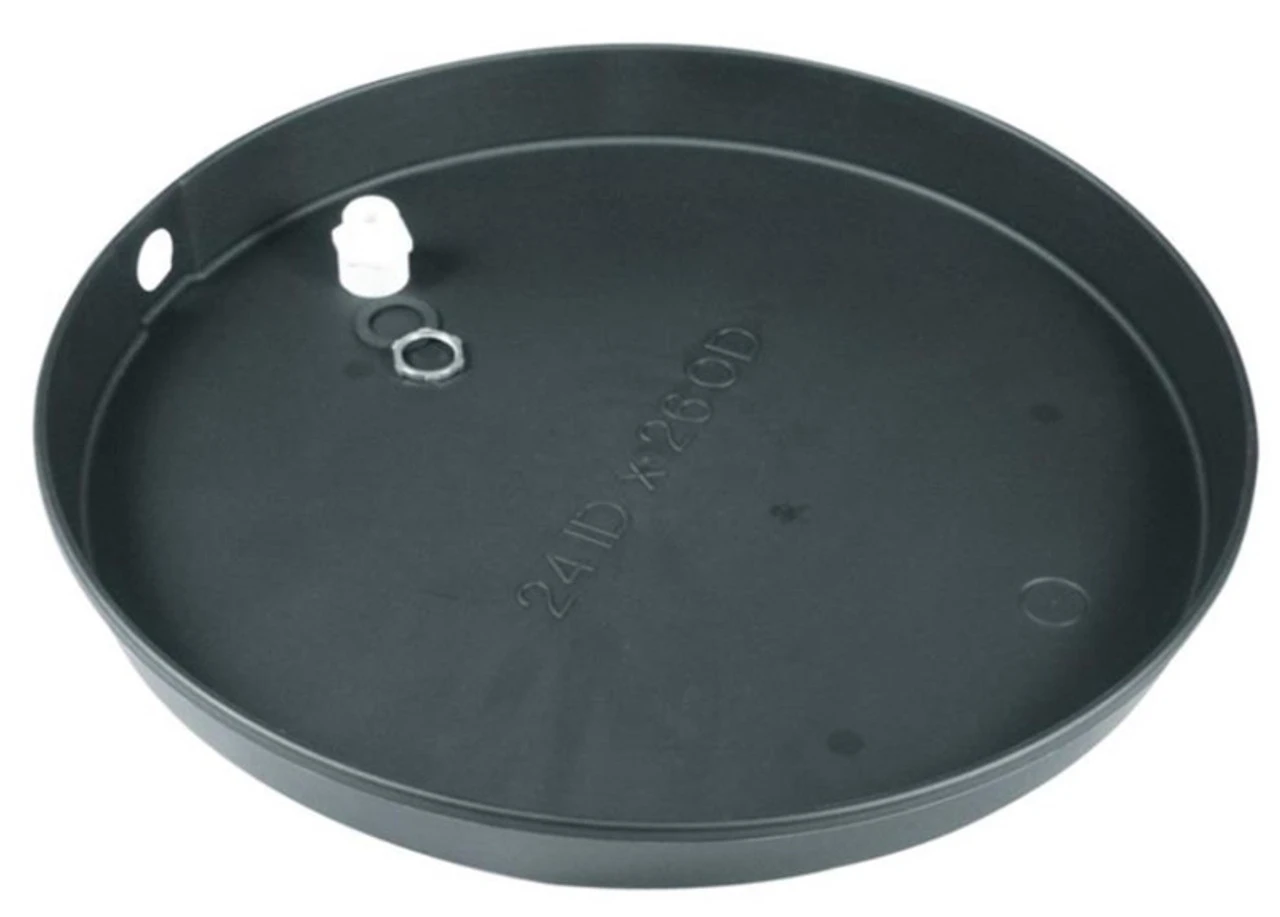 For electric water heaters only. Heavy duty polypropylene. Dual size 1 inch to 1.5 inch PVC drain fitting with gaskets included. Sides are 2.5 inches deep. Pre-cut side opening for drain fitting.