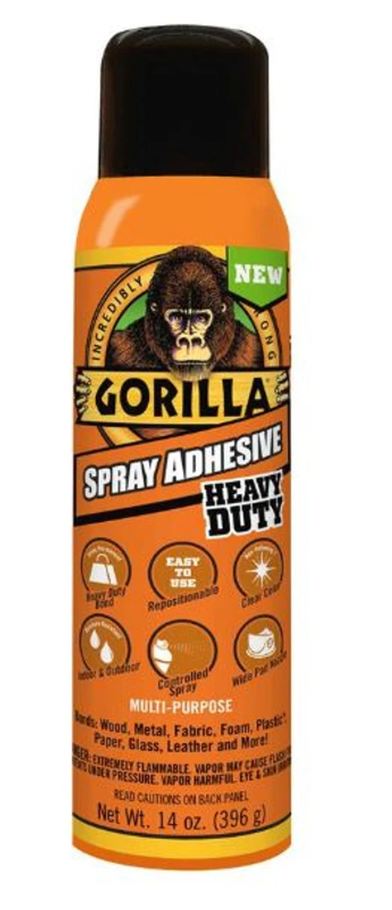 Gorilla Spray Adhesive is heavy duty, multi-purpose and easy to use. Gorilla Spray adhesive forms a clear, permanent bond that is moisture resistant and can be used on projects both indoors and out. Its wide pad nozzle and controlled spray provide an even application on the project you are working on.