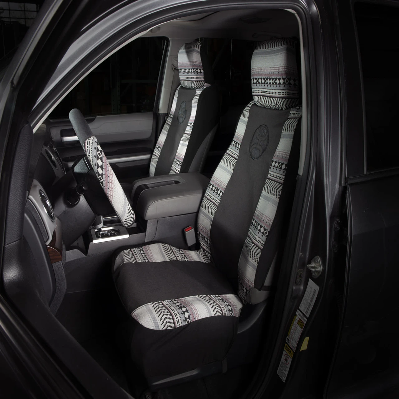 Introducing the Hooey Low Back Seat Cover. Charcoal/Baja detailing collides with heavy duty polyester to create a perfect combination of rugged durability, and modern western detail. Hooey seat covers offer optimum protection and style for your vehicle.
