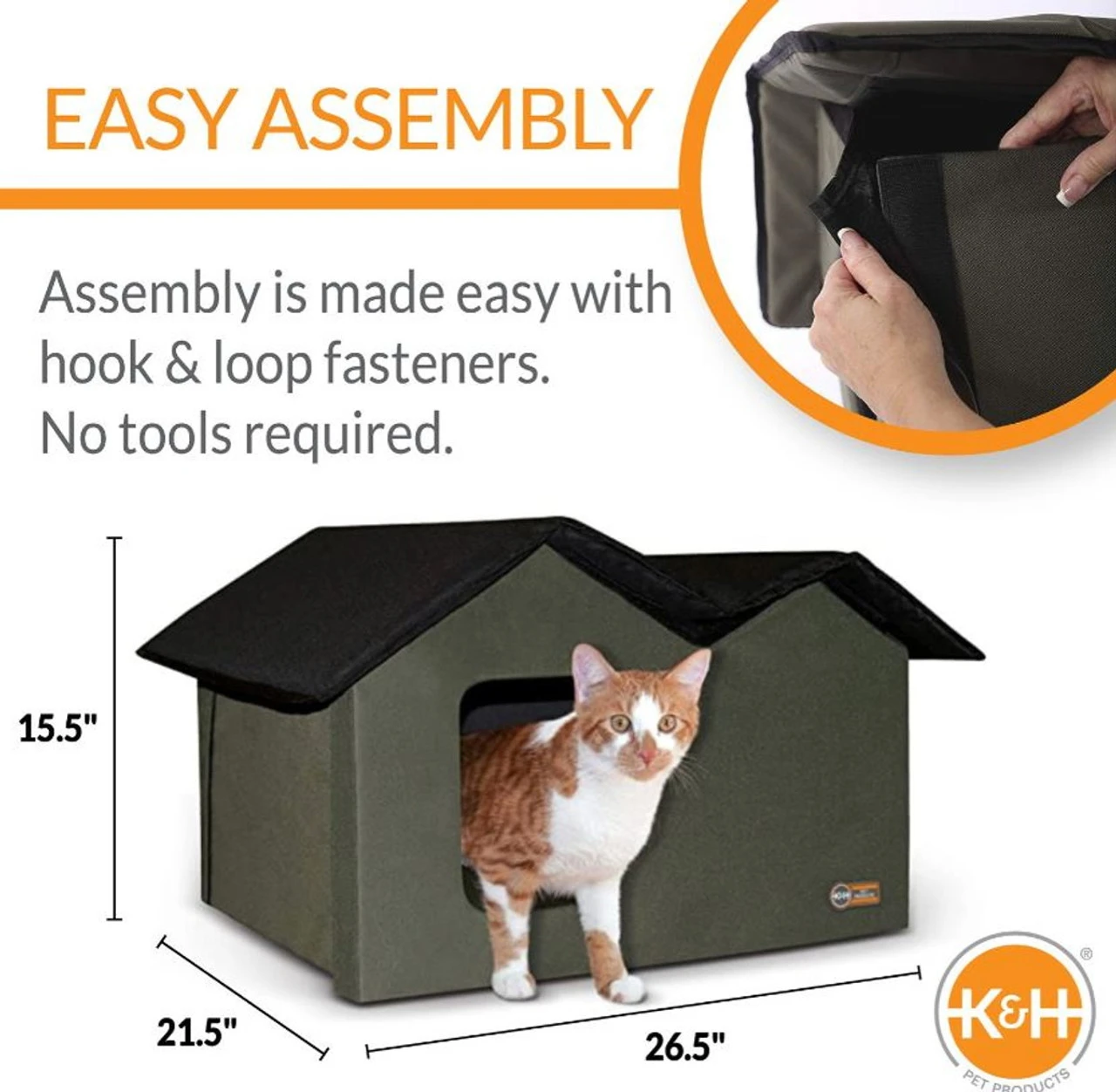 The K&H Pet Products Extra-Wide Outdoor Unheated Kitty House provides a safe shelter for outdoor cats. This extra-wide house is large enough to accommodate several cats at once. There are two exits for easy entry and to avoid the risk of being trapped by predators. It’s got all of the comforts of home with a machine washable Berber pad included to keep kitties cozy. The velcro roof makes it super-easy to assemble so your cats can start enjoying their new home right away.