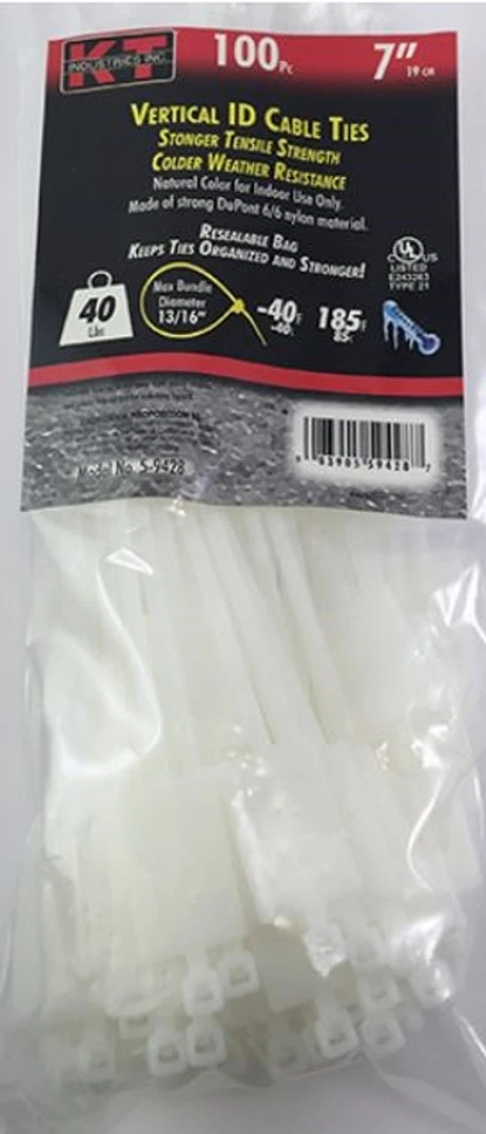Perfect for marking and keeping cable identified. KT ID cable ties are made from strong DuPont 6/6 nylon material. This material yields a higher break points even at colder temperatures then the competition. Packaged in resealable bags to help preserve moisture and keeps ties organized. Higher moisture gives most zip ties more tensile strength. UL listed. To be used indoors. Length is approximate. 1.7″ bundle diameter For indoor use only -40ÂF – 185ÂF 50lbs break strength
