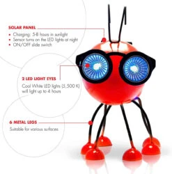 Solar Ant Garden Light This handsome fire ant will add a colorful charm to your garden, bringing a lot of happy smiles to your friends, quests, neighbors, children and relatives. This cute piece of art for your garden absorbs sunlight during the day and accumulates electricity to make the vivid LED eyes glow in the evening and bring a lot of joy in your garden. The three-layer UV resistant high-quality painting will not fade from the sunlight and will protect the steel body against rusting and corrosion caused by the rain and the moisture. Unlike plastic decorations this one will not degrade in the sun and the colors will not fade. The figureâs lovely appearance and creative design makes this yard art decor an ideal housewarming or birthday present. It will stand out among your home, garden, backyard, pond, lawn or yard decor. Specification: 1. Material: Steel 2. Battery: 1 x R1S80H-A1 1.2V NI-MH Rechargeable Battery (Included) 3. LEDs: Two 4. Light Color Temperature: 5,500 K (Cool White) 5. Solar Panel: Monocrystalline 6. Switch: Slider ON/OFF switch 7. Charging Time: 5 – 8 Hours 8. Run Time: Up to 4 Hours 9. Ant Dimensions: 10.2 x 10.6 x 4.7 Inch (H x L x W) 10. Weight: 0.7 pound 11. 100 Percent Renewable Energy 12. 95 Percent Recyclable Materials Package Includes: 1 x Solar Red Ant Figurine