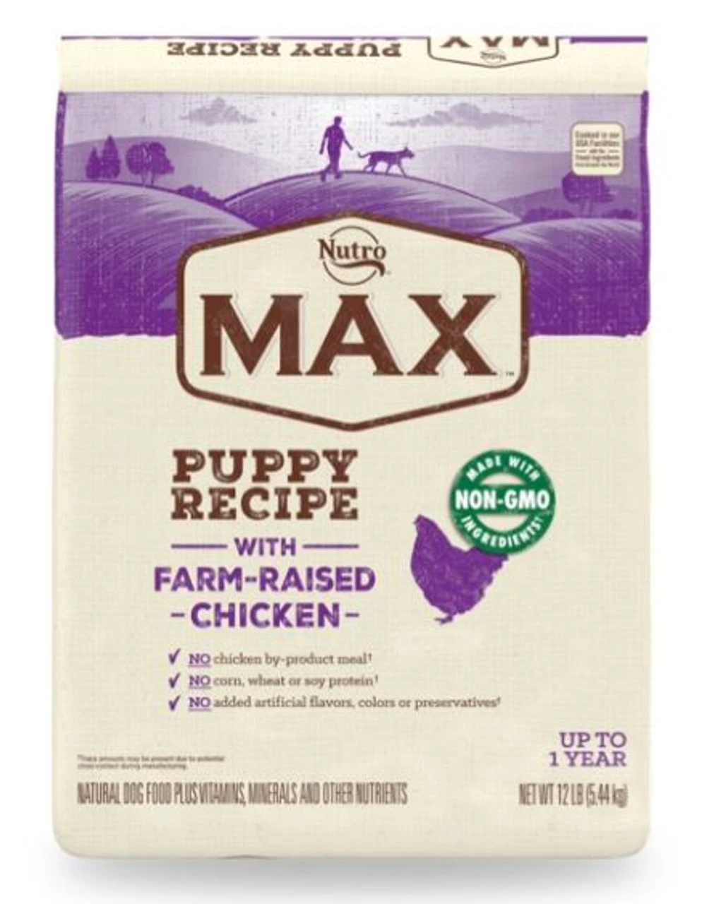 Nutro Max Puppy Recipe with Farm-Raised Chicken dog food for up to 1 year. NO Chicken by-product meal. NO Corn, wheat or soy protein. NO added artificial flavors, colors or preservatives. Natural dog food plus vitamins, minerals and other nutrients.