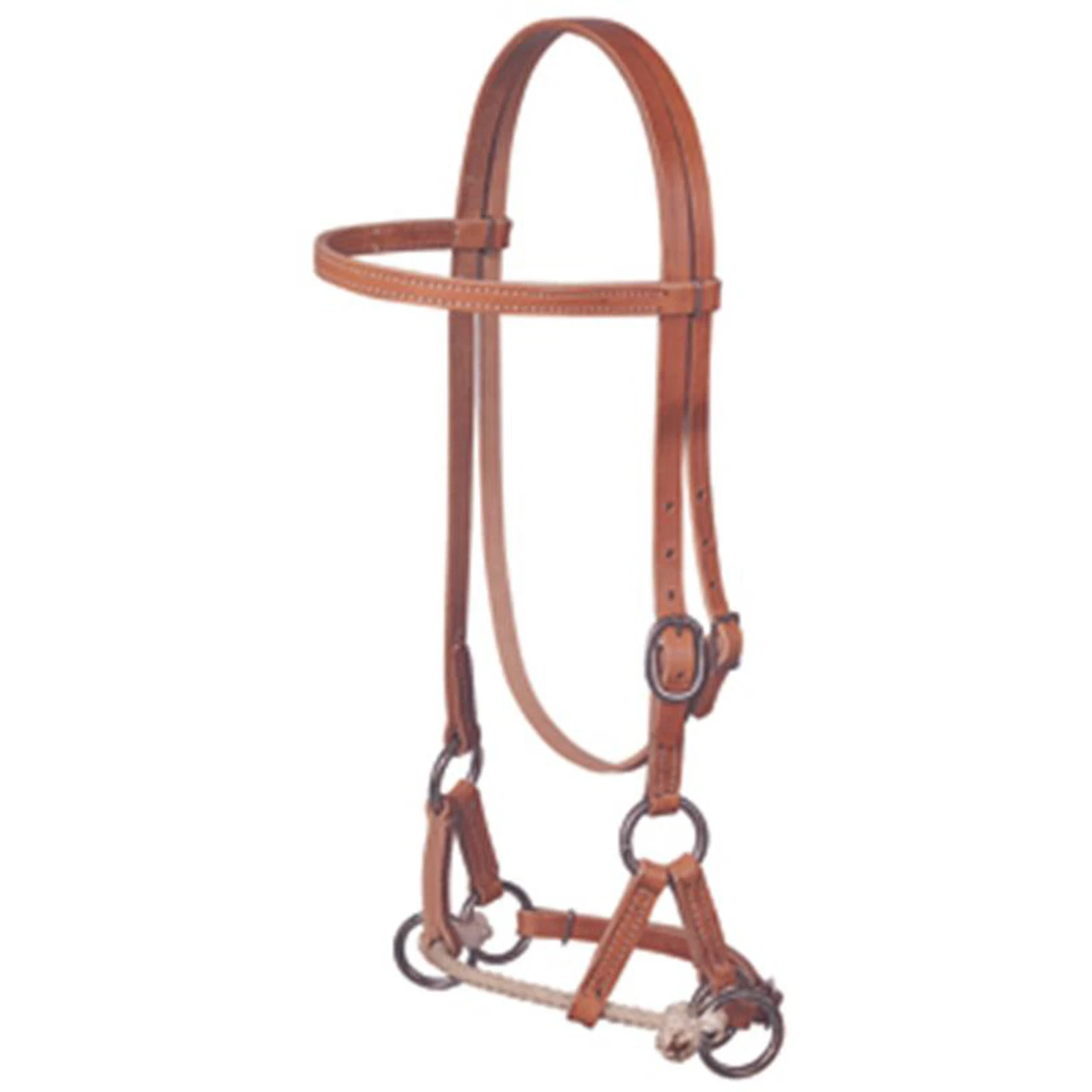 This durable, weather resistant Hermann Oak russet harness leather headstall has a single rope nosepiece for side to side pulling action on the face. The second ring rein attachment allows the rope noseband to roll across the nose. Durable nickel plated
