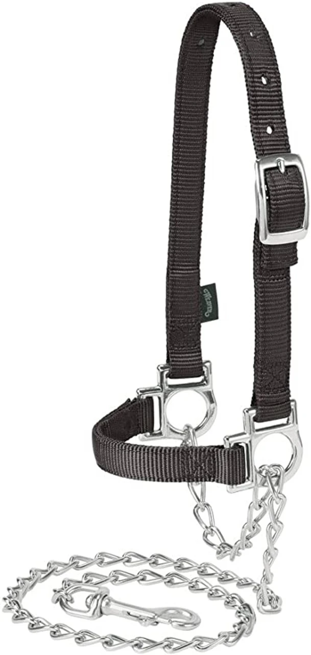 - Black, 3/4″ doubled and stitched nylon adjustable sheep halter with chain lead